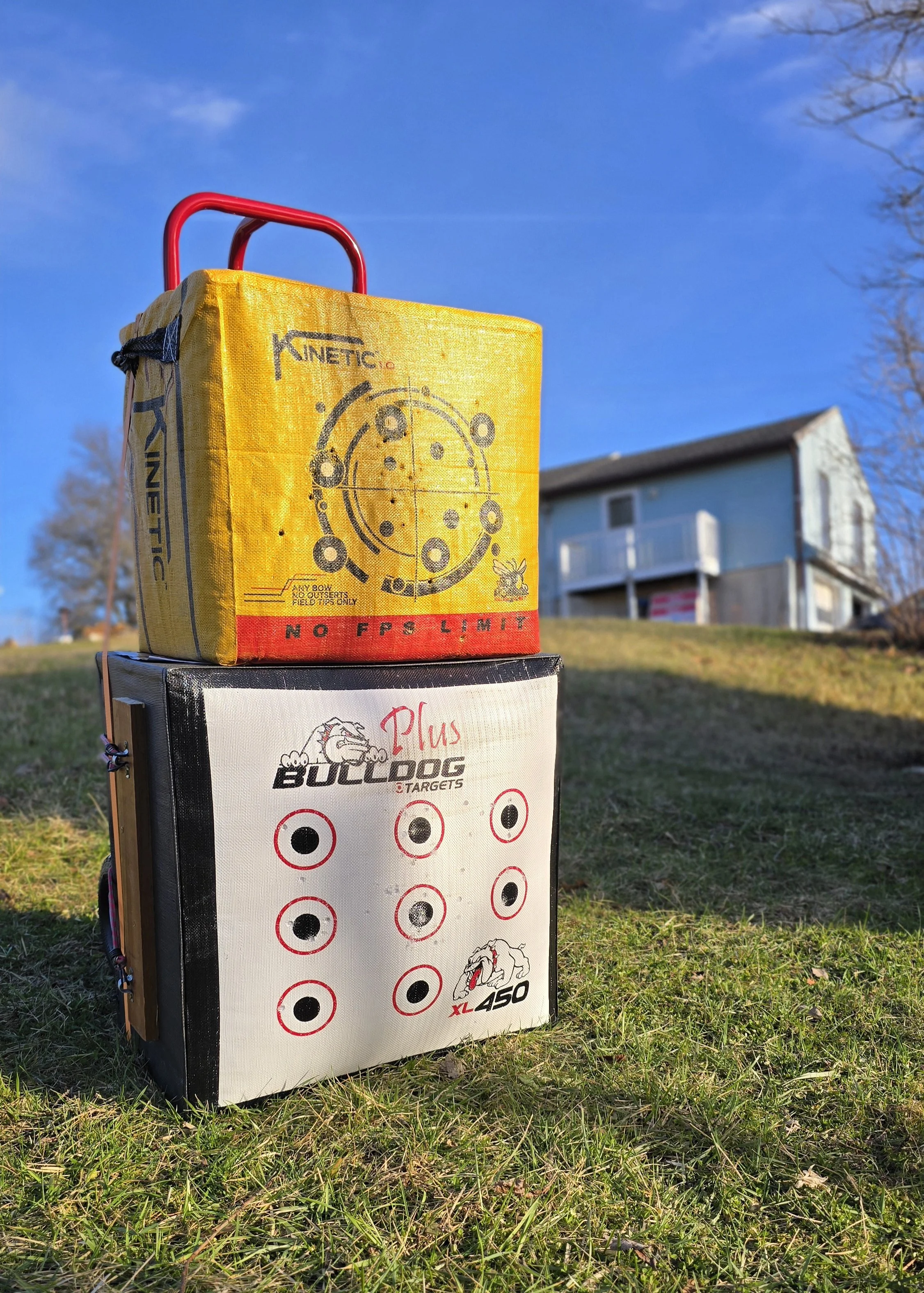 HANDS DOWN my favorite target for field points is the Bulldog 450 XL Plus— the “Doghouse XL 450 Archery Target.” Bunjie and I LOVE this target! Well, it really doesn’t matter what Bunjie likes, does it? Bunjie likes just about any target, because Bunjie is an old, slow crossbow! What’s more important is that the Ravin R29X LOVES this target, too! Yep, the new Bulldog stops arrows from the 450 fps Black Widow with ease! And they pull out with two fingers!